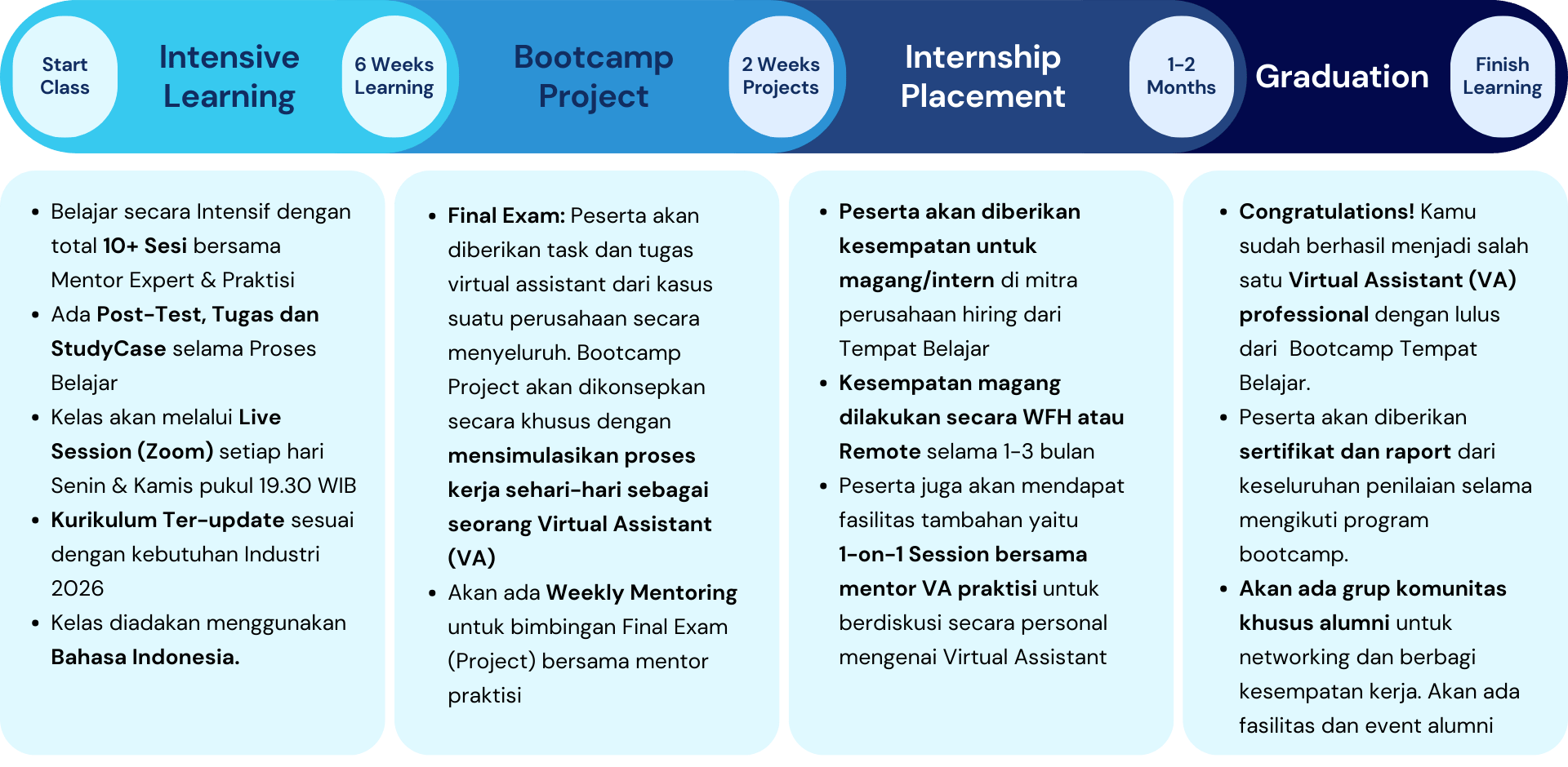 Belajar dan praktik secara intensif selama 6 Minggu tentang materi terupdate virtual assistant (VA) bersama mentor berpengalaman.