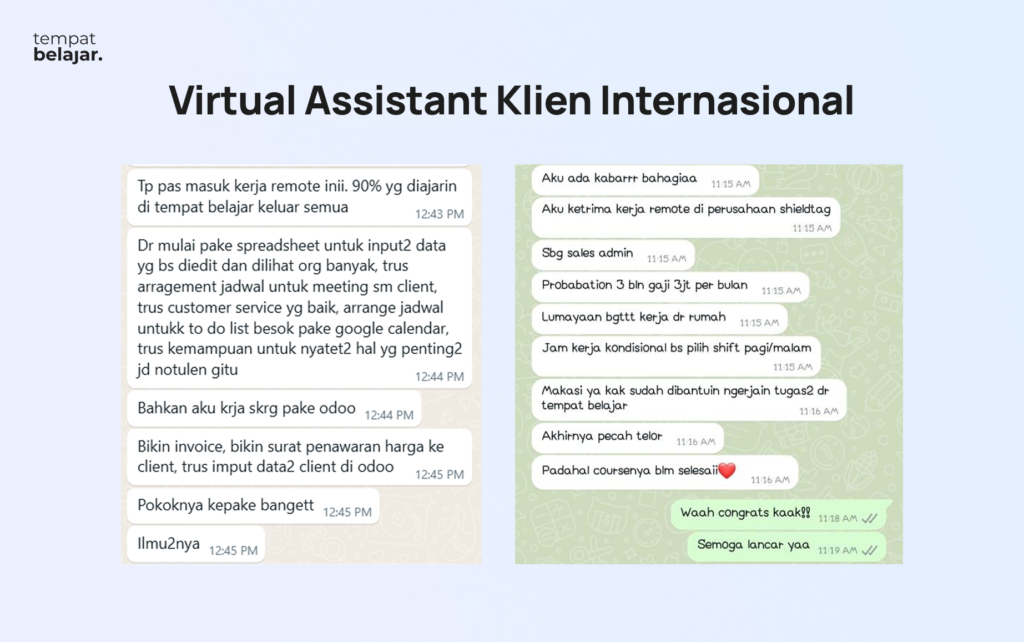 Pencapaian ini membuktikan bahwa karier Virtual Assistant bisa dimulai bahkan sebelum program pelatihan selesai, selama memiliki kesiapan dan strategi yang tepat.